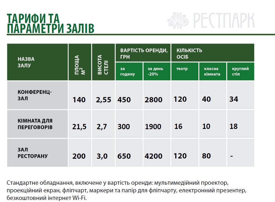 Даний зал можливо додатково обладнати мультимедійним проектором, проекційним екраном, фліпчартом.